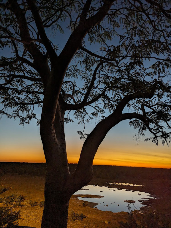 Hon måste ta sig upp. De bara fötterna snubblar över taggbuskarna som sticker upp ur den torra jorden. En liten bushbaby med klotrunda mangaögon stirrar ner från en av Änglatrumpetens blomförsedda grenar. Trädet, med sina vackra trumpetformade blommor, utgör en bjärt kontrast mot den torra buskvegetationen. Kanske har det planterats av några rangers som haft sin camp här ...
